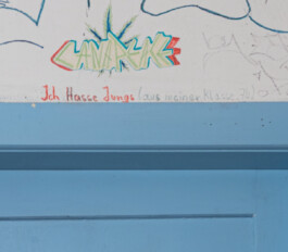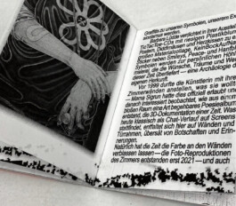 Vor 1999 durfte die Künstlerin mit ihren Zimmerwänden anstellen, was sie wollte – Mama Sigrun hatte dies offiziell erlaubt und danach interessiert beobachtet, wie aus einem bloßen Raum eine Art begehbares Poesiealbum entstand, die 3D-Dokumentation einer Zeit. Was heute klassisch als Chat-Verlauf auf Screens stattfindet, entfaltet sich hier auf Wänden und Türrahmen, übersät von Botschaften und Erinnerungen.