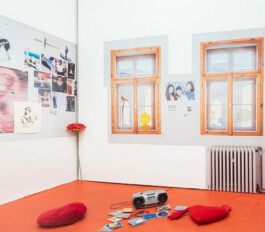 Der Ausstellungsraum ist mit Foto-Plots in Originalgröße tapeziert, dazwischen finden sich Zeichnungen aus verschiedenen Jahren, Relikte und Symbole aus der Jugend, die teils bis heute in den Werken der Künstlerin auftauchen, die sich seit jeher gern mit sozialen Codes und Ritualen beschäftigt.